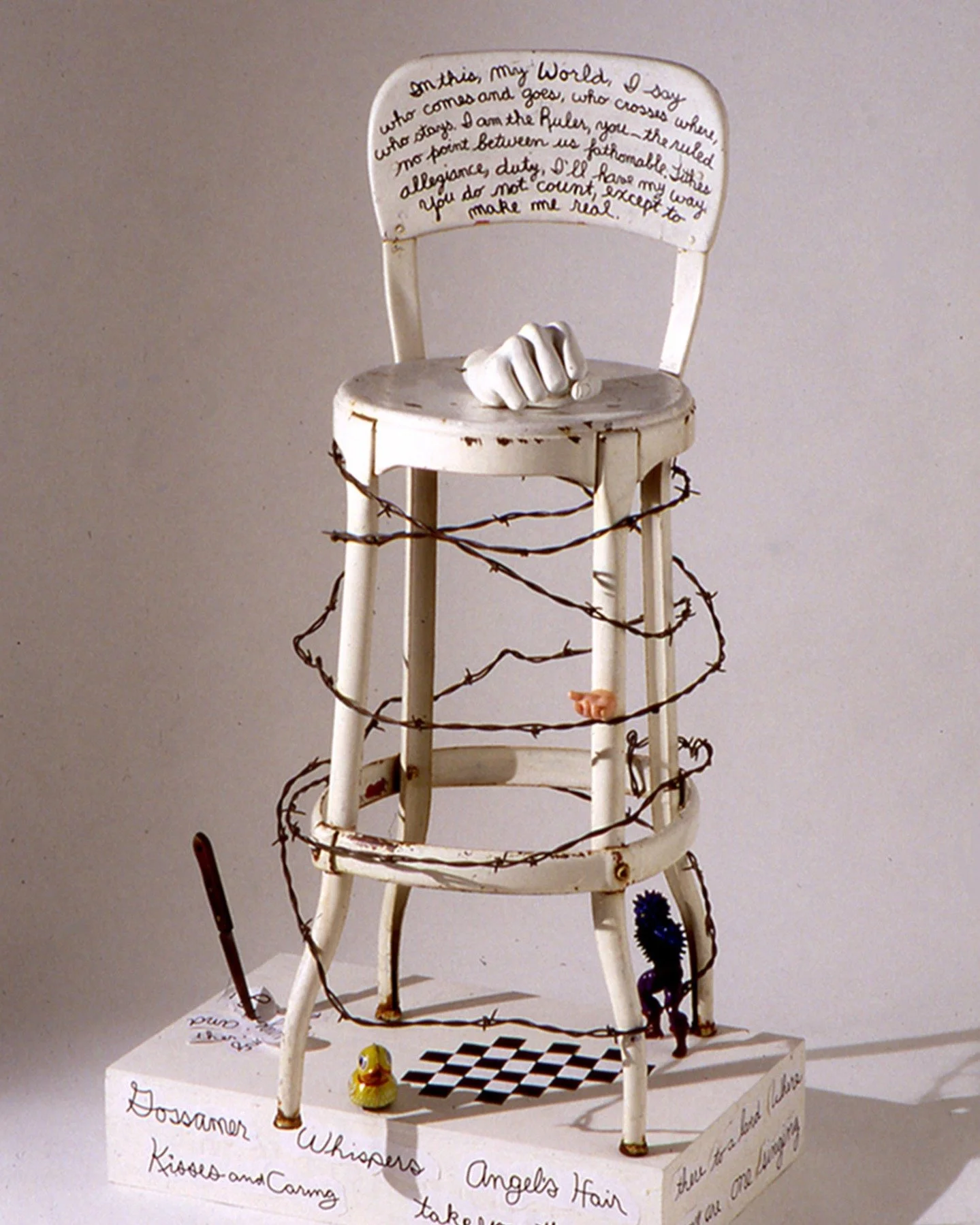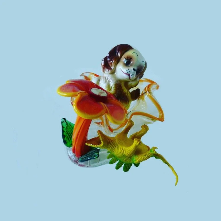 Rocking horse, mink collar, ribbon, feather boa, plastic doll face, digital drawing.